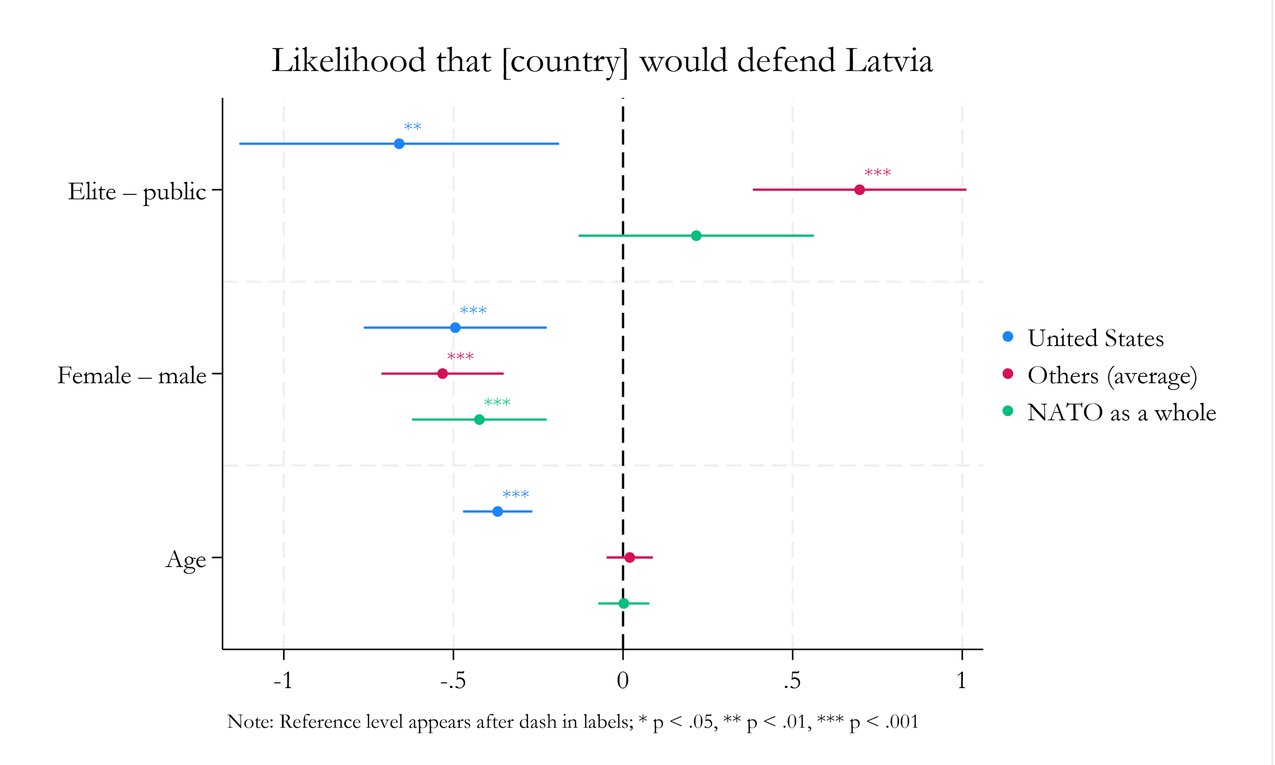 We ran three OLS regression models, each with a dependent variable capturing the perceived likelihood of different actors defending Latvia (9-point scale from “extremely unlikely” to “extremely likely”): (1) the United States, (2) the average likelihood across other surveyed countries (i.e., the United Kingdom, France, Germany, Poland, and Canada), and (3) NATO as a whole. All models include controls for respondent type (public vs. elite), gender, and age. The results are presented in the coefficient plot below and summarized in Table 1.