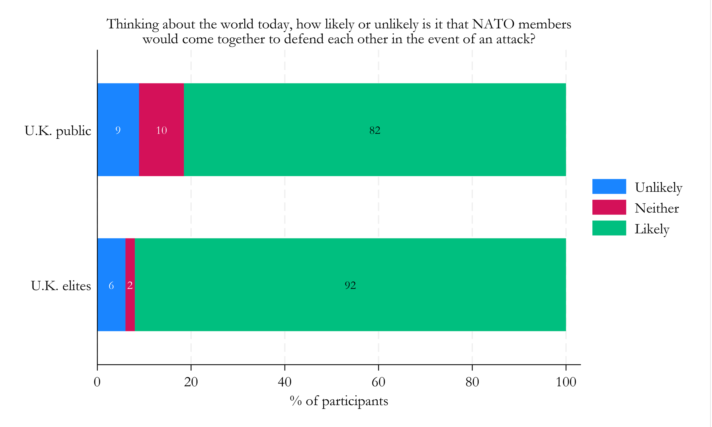 We surveyed 100 sitting members of the British parliament via Survation’s parliamentary omnibus poll and a representative sample of the general public in the United Kingdom via the IPSOS polling company in April/May 2025. In the online survey, we first presented the participants with a short description of NATO as a military alliance and its collective defense commitments under Article V. In turn, we asked them to imagine a hypothetical war between Russia and Latvia. The participants subsequently indicated how likely or unlikely (on a 9-point Likert scale) the following actors were to send their armed forces to defend Latvia in this scenario: the United States, the United Kingdom, France, Germany, Poland, Canada, and NATO as a whole.