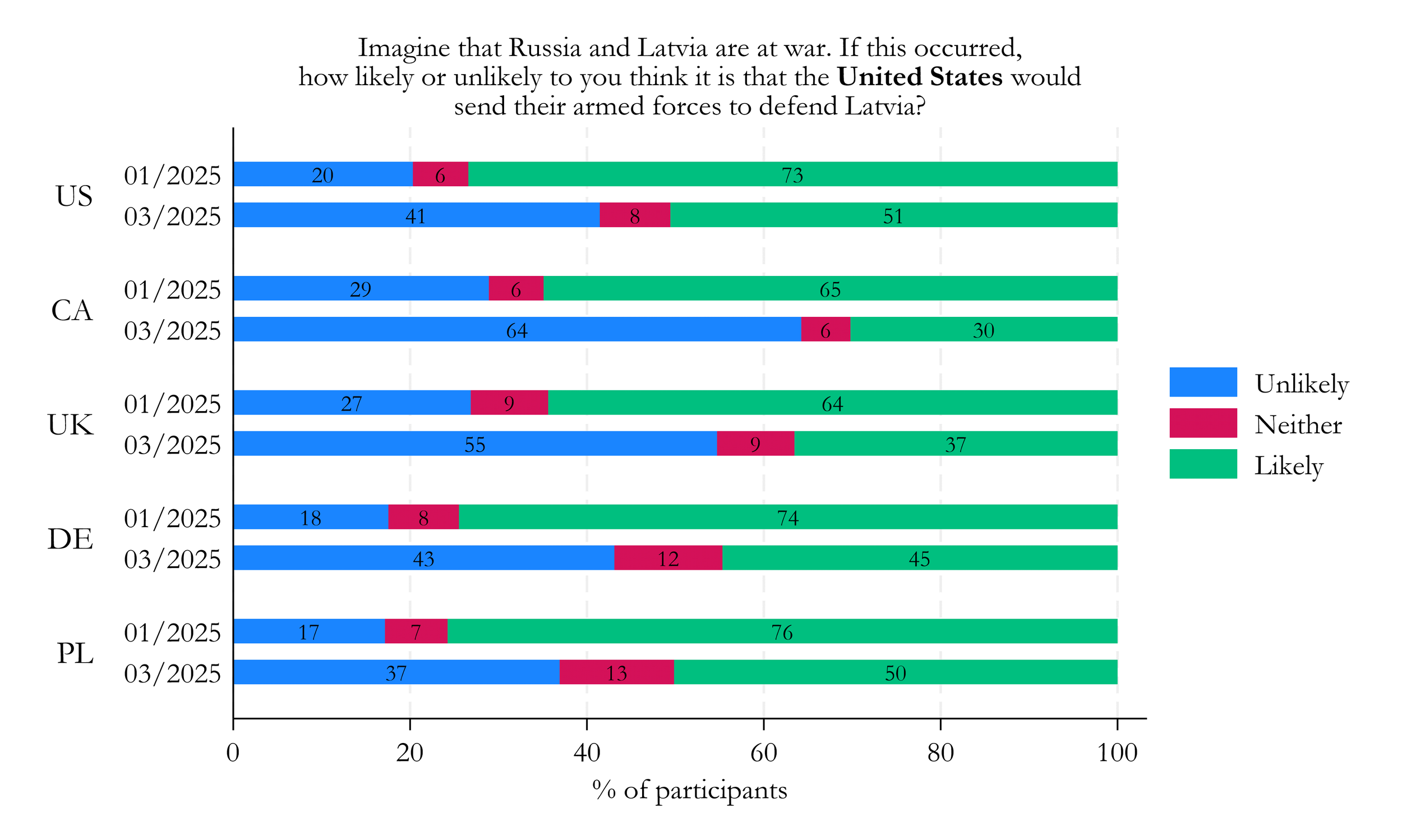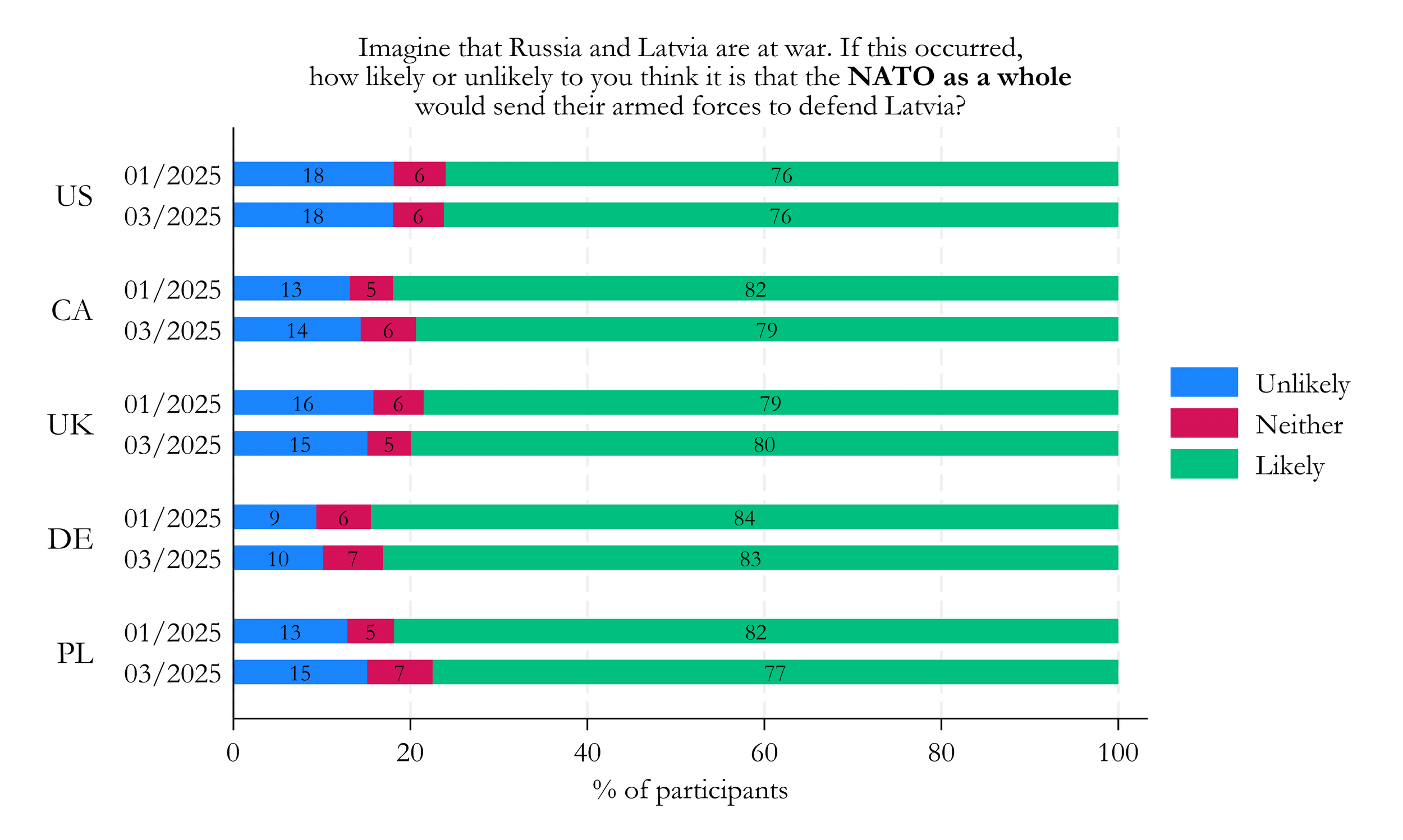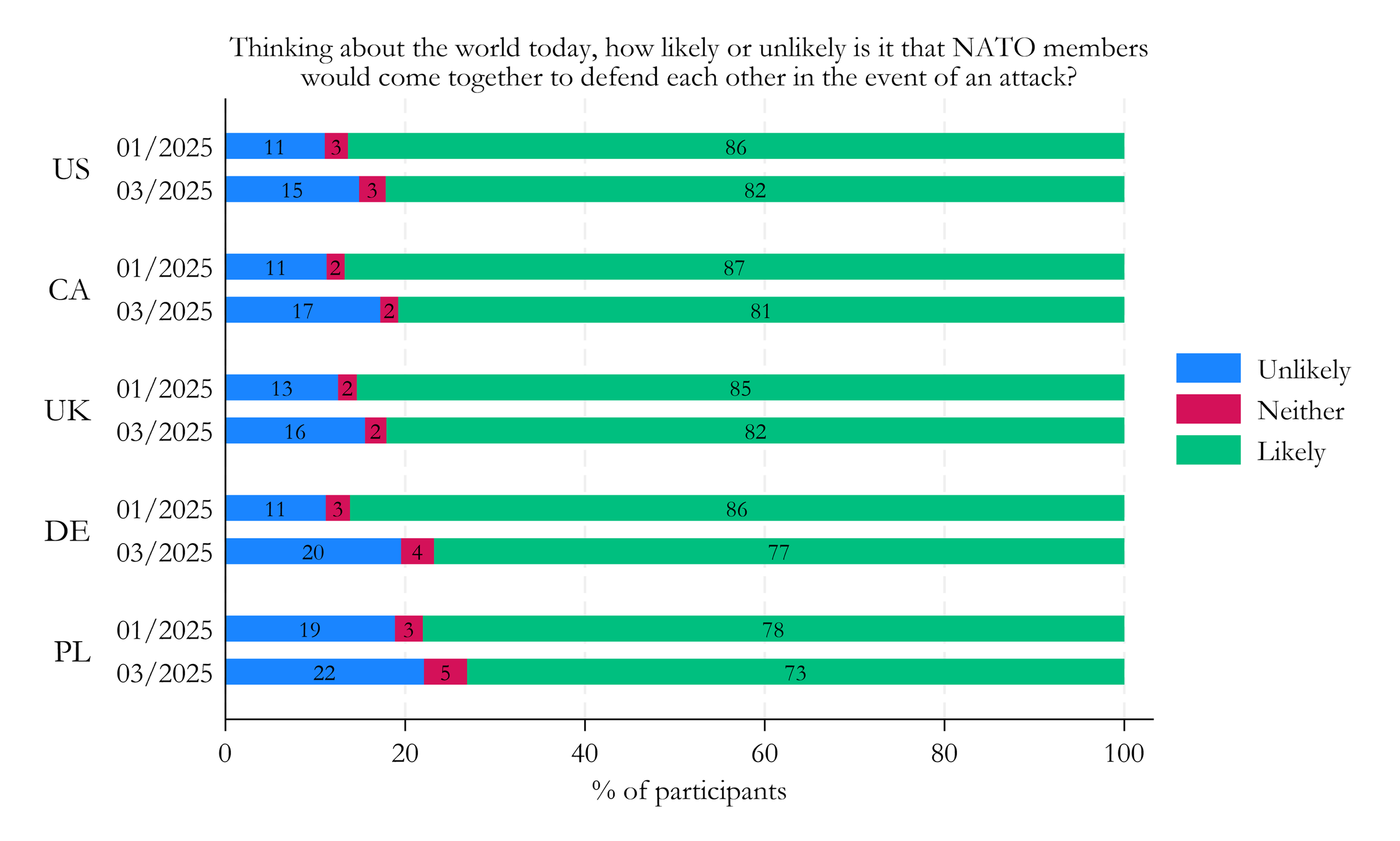 In the original preregistration, we noted our intention to retain the flexibility to conduct ad hoc surveys following significant future events that may plausibly influence public attitudes in this area. As of early March 2025, we have experienced an unprecedently belligerent rhetoric with respect to the European allies and Ukraine, a cessation of the U.S. military assistance to Kyiv, and a reproachment with the Russian Federation. Many foreign policy commentators have noted that these significant events have already damaged the credibility of U.S. commitments to NATO. The ad hoc March 2025 survey allows us to investigate the impact of these events by comparing the current views on collective defense credibility with those we found in our first survey round in January 2025.