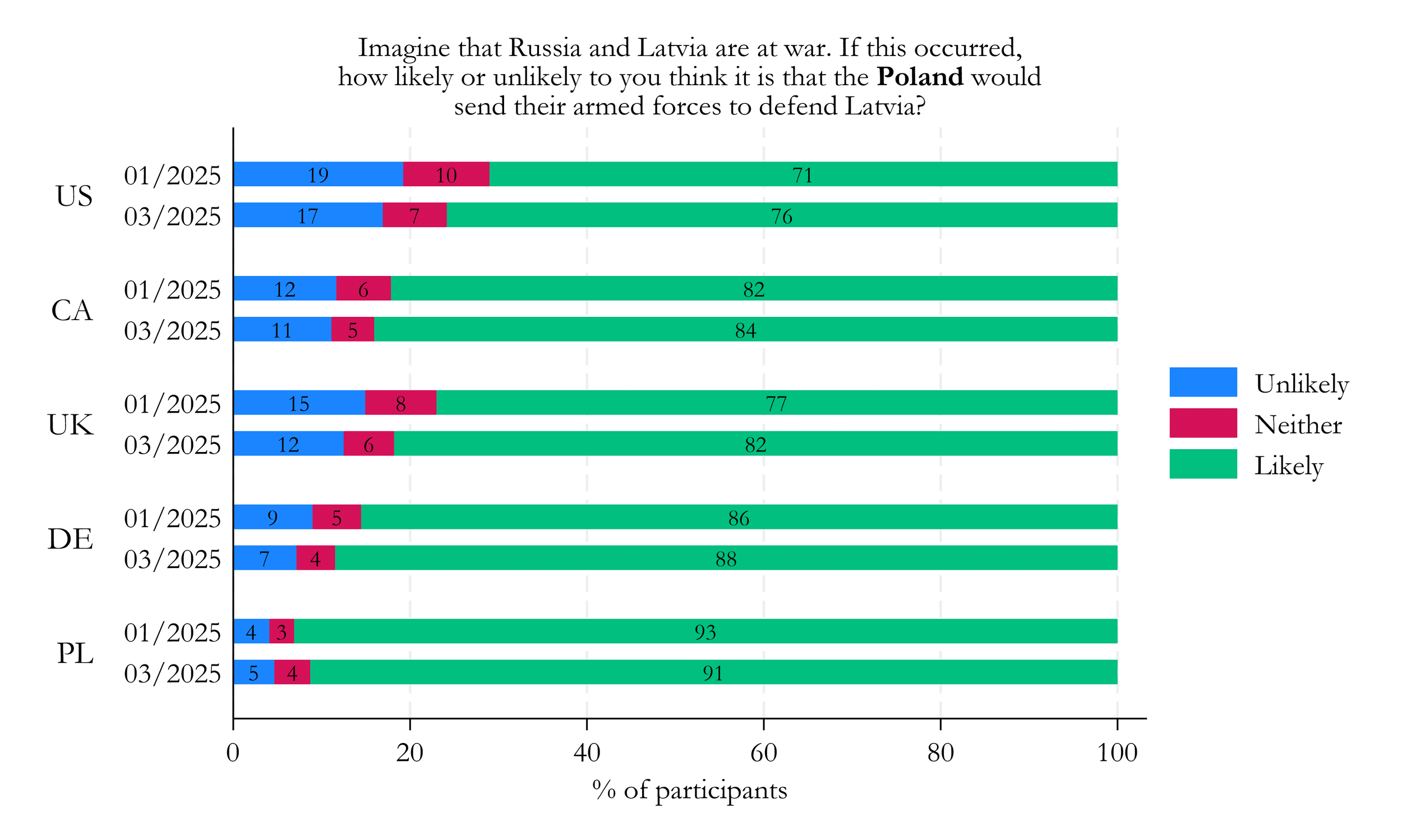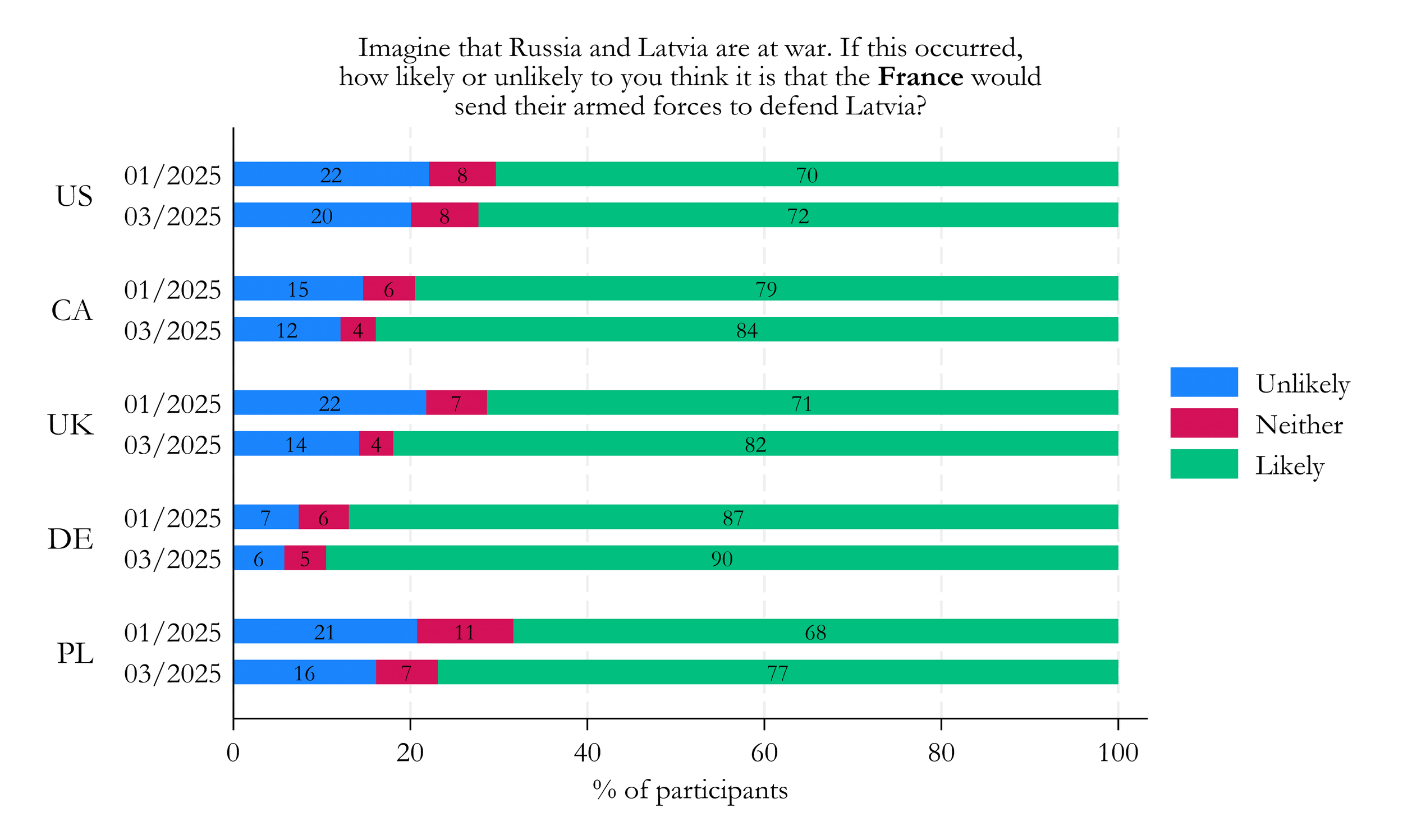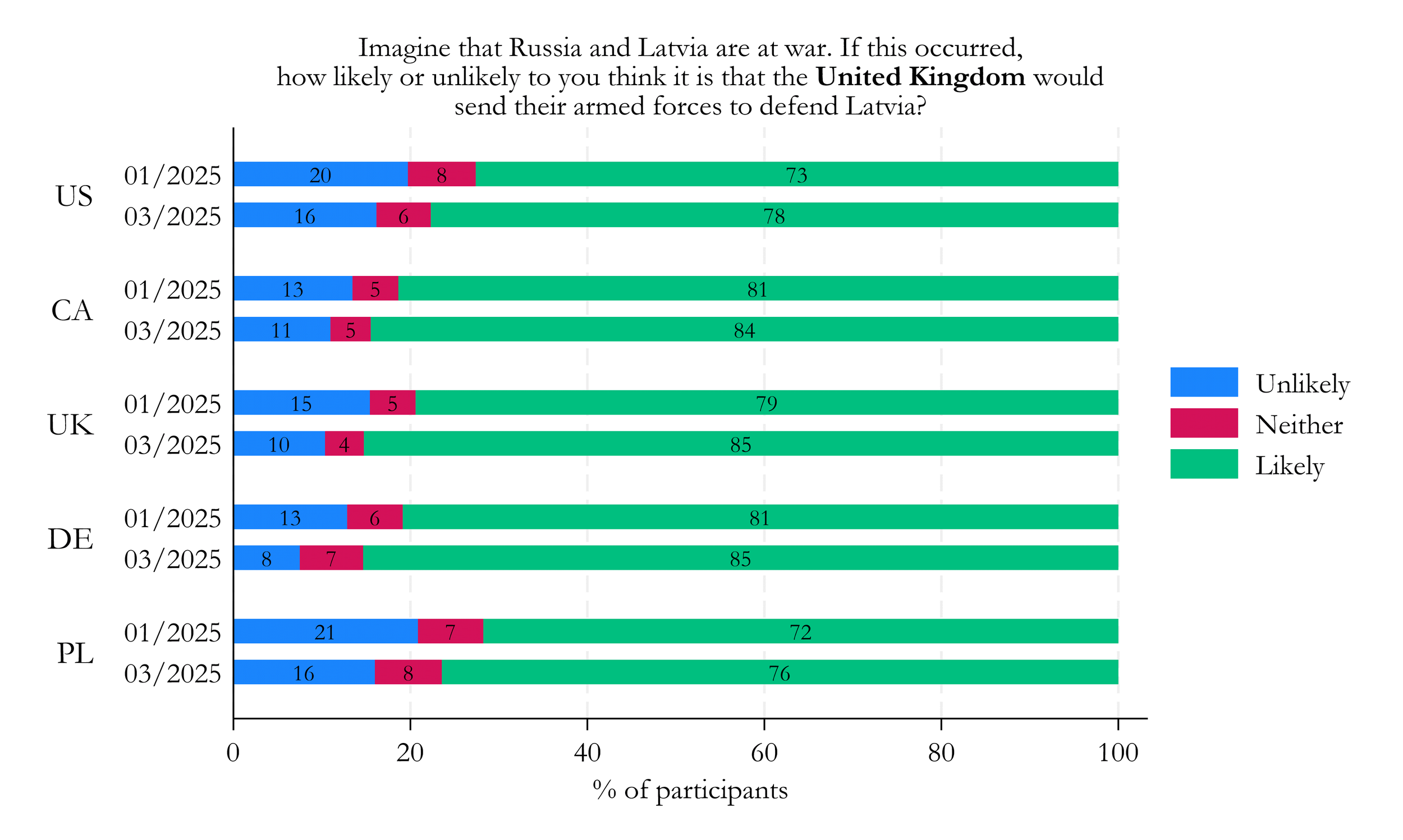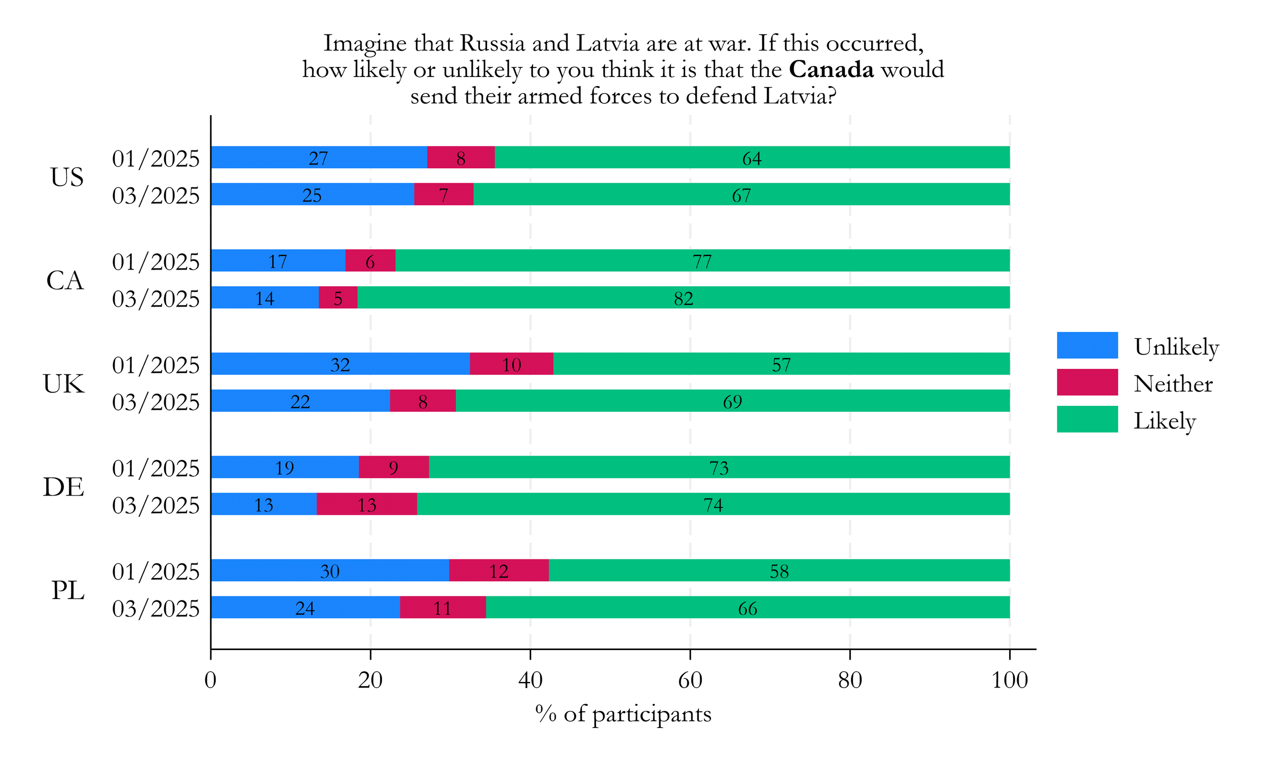 In the original preregistration, we noted our intention to retain the flexibility to conduct ad hoc surveys following significant future events that may plausibly influence public attitudes in this area. As of early March 2025, we have experienced an unprecedently belligerent rhetoric with respect to the European allies and Ukraine, a cessation of the U.S. military assistance to Kyiv, and a reproachment with the Russian Federation. Many foreign policy commentators have noted that these significant events have already damaged the credibility of U.S. commitments to NATO. The ad hoc March 2025 survey allows us to investigate the impact of these events by comparing the current views on collective defense credibility with those we found in our first survey round in January 2025.